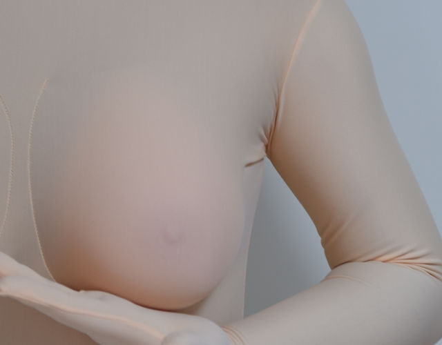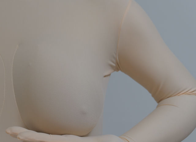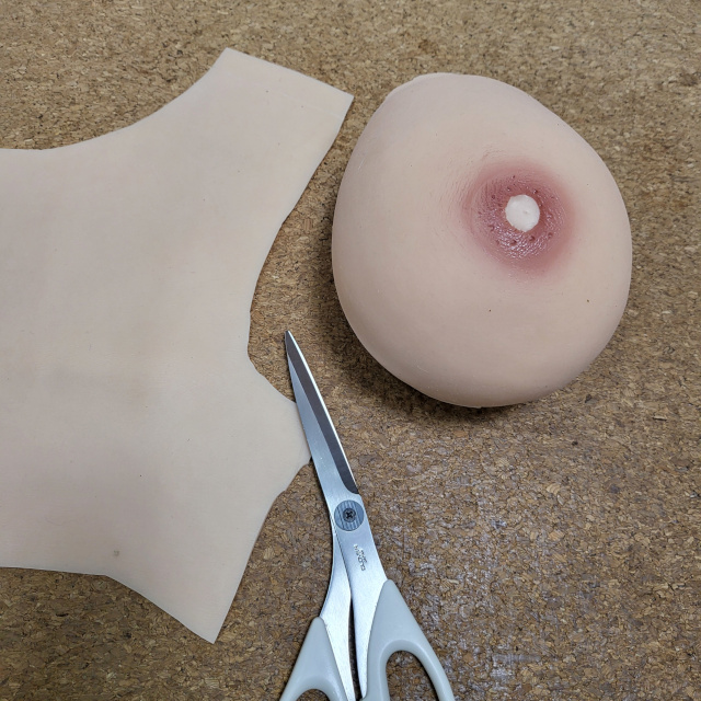 ↑(写真は開発中のもので、実際には専用インナー生地と同じ素材を使用します)専用生地をご指定いただいた場合、Cカップ~Gカップ対応の「バストカバー」が付属します。シリコンバストやウレタンバストにかぶせることで、インナー生地との色調が統一されます。