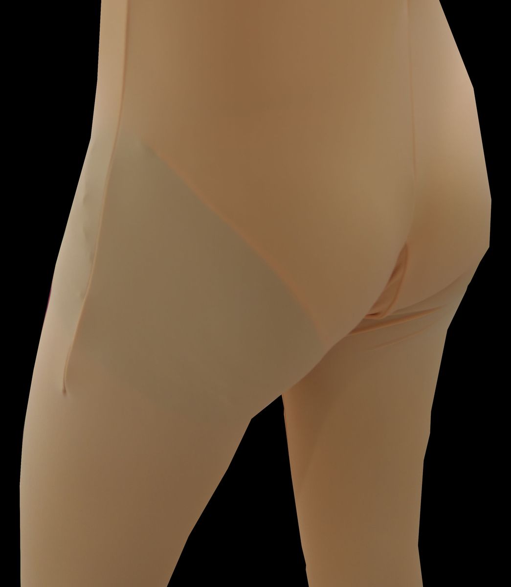 腕・足・首まわりなどの境目が特に透けやすくなりますが、当店の「専用生地」はインナーが肌タイツから透けにくいよう工夫されたものです。生地自体は「どーる」と同一で、日本人男性の平均的な肌色に合わせて着色することで、地肌とインナーの色を近づけ、透けを抑えています。