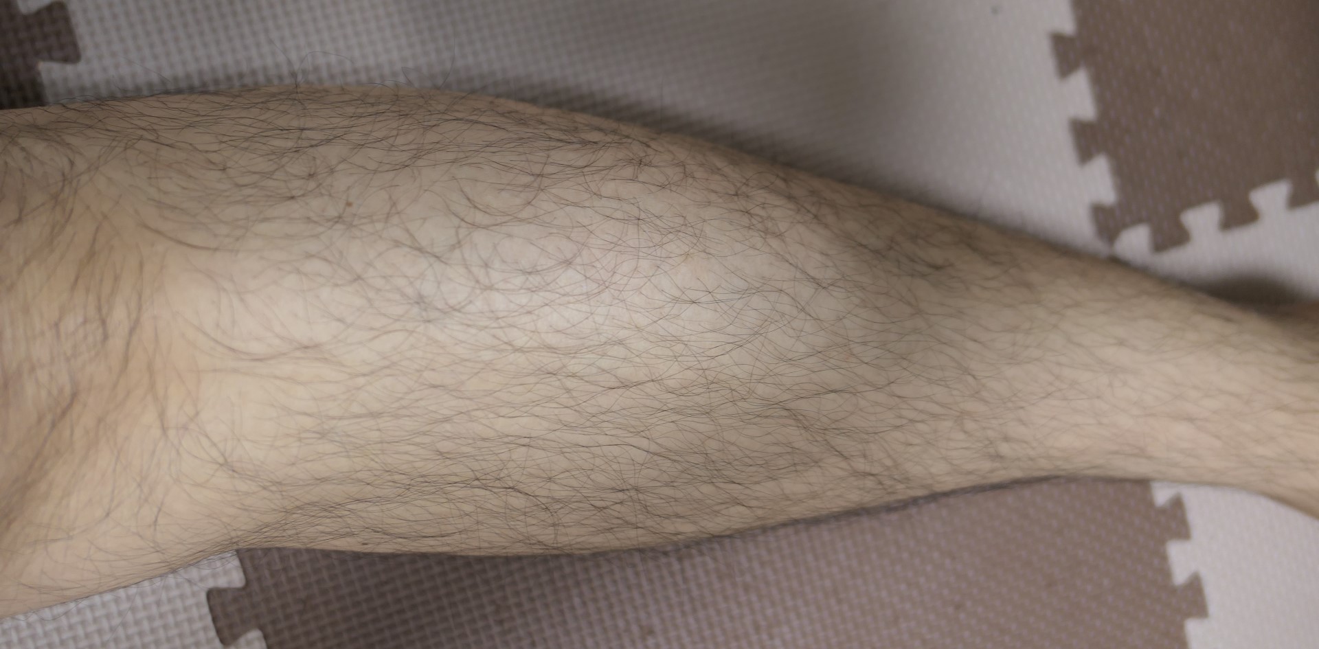 他の生地とくらべて若干生地が薄めです。概ねの目安ですが↓写真のすね毛の濃さが、どーる生地が隠蔽できる限界点です。これ以上毛量が多い方は他の生地をお勧めです。